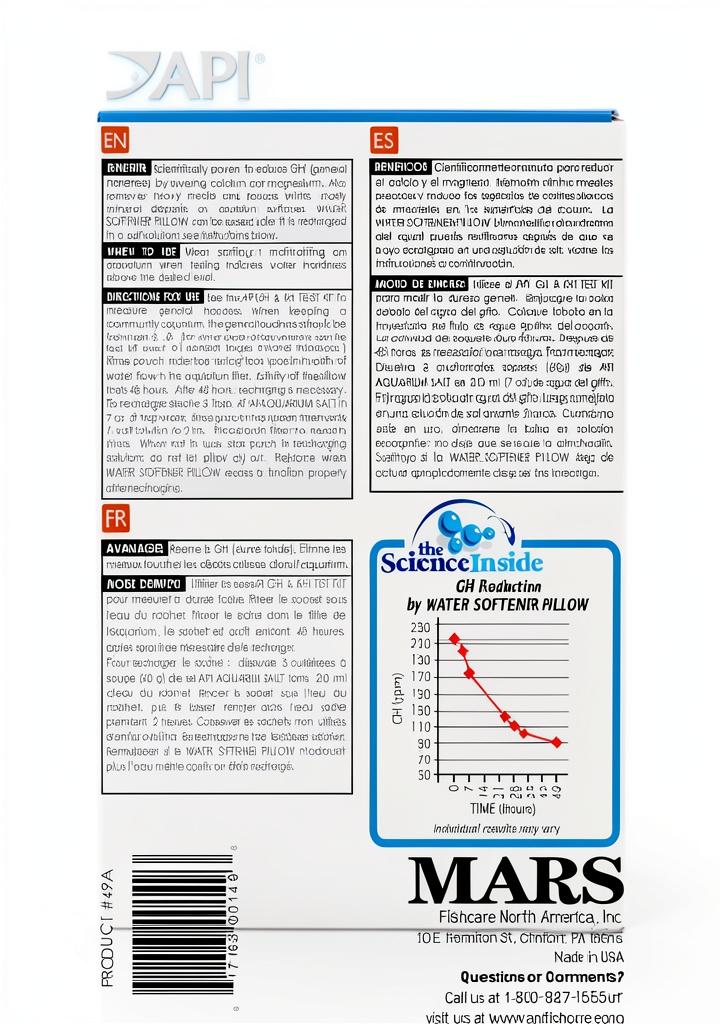 The API Water Softener Pillow is a specialized filtration pouch designed to address hard water issues in freshwater aquariums. Manufactured by Mars Fishcare, this product measures 4.5 x 1 x 7.38 inches and weighs 2.4 ounces, with model number 49A. It works by lowering general hardness through the reduction of calcium and magnesium, ensuring a stable environment for aquatic life. The pouch is pre-dosed for convenience and fits a wide range of canister filters, making it a versatile solution for aquarium maintenance.